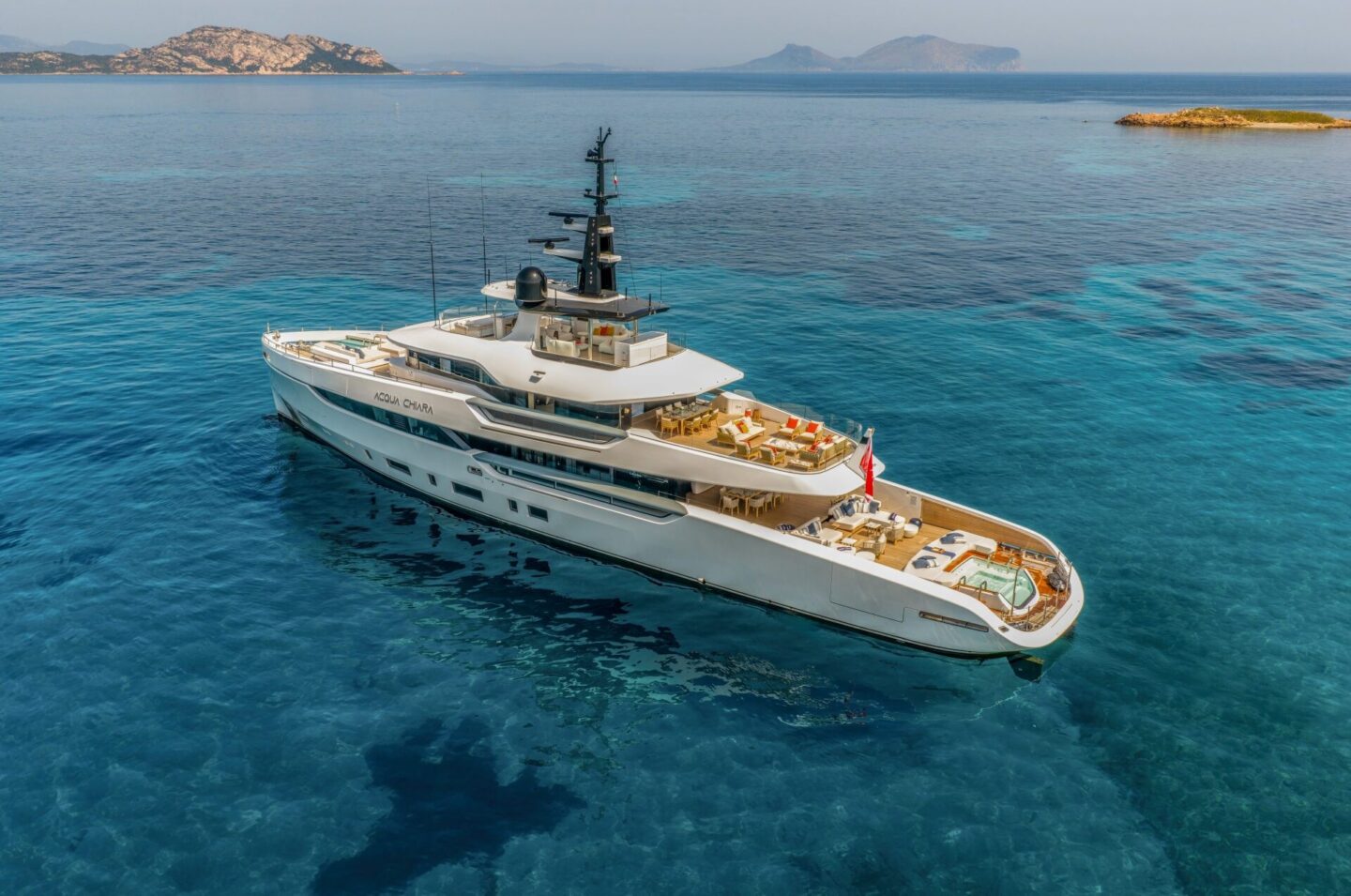 Der Pool ist ganz mit den eleganten Moon Teak-Liegen von Cristian Visentin.
