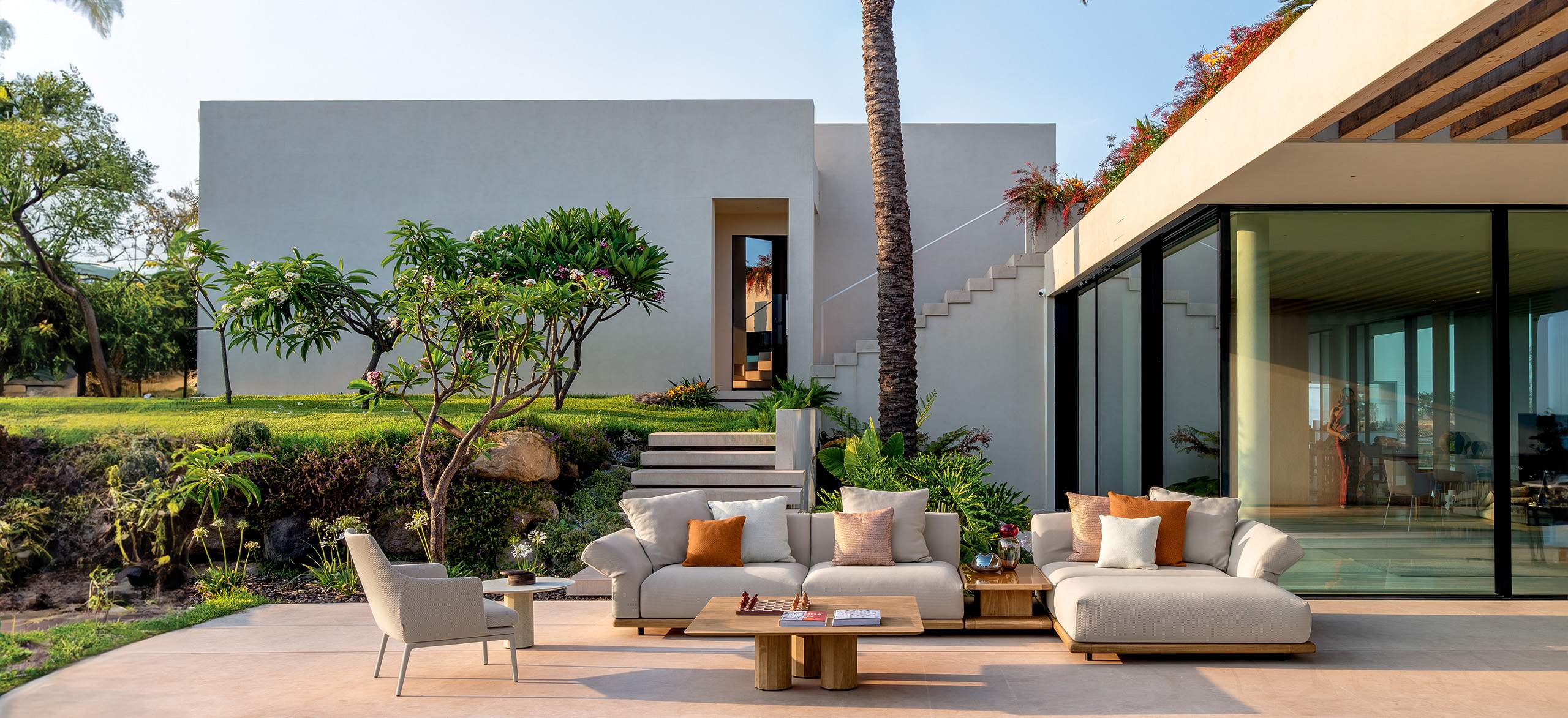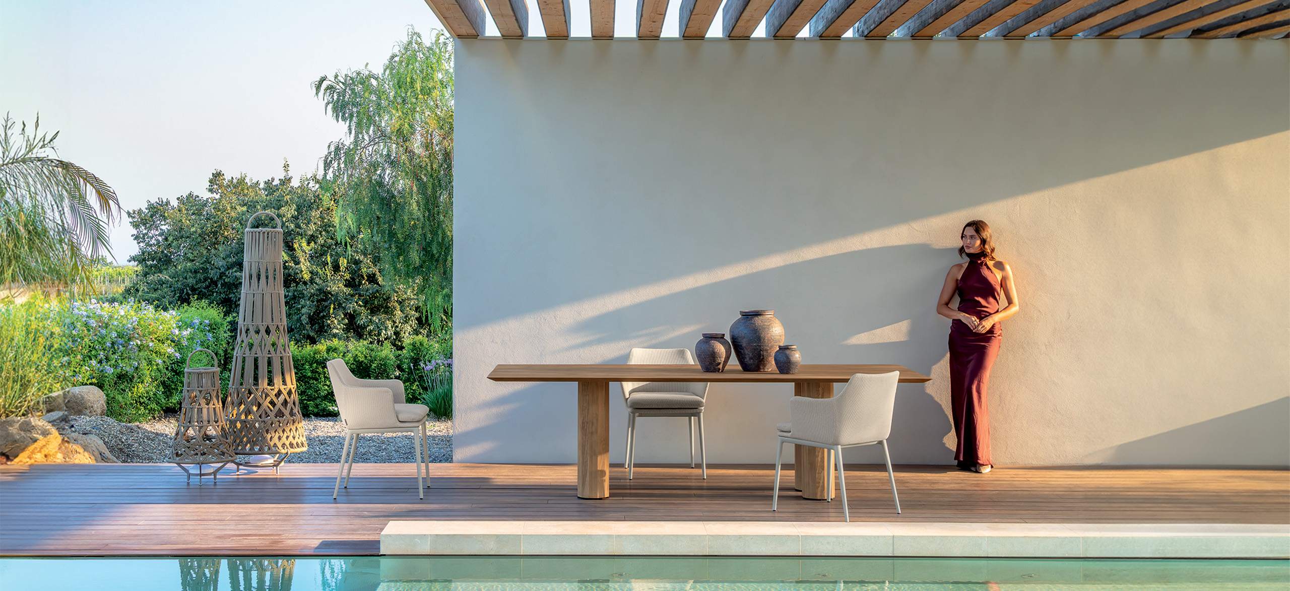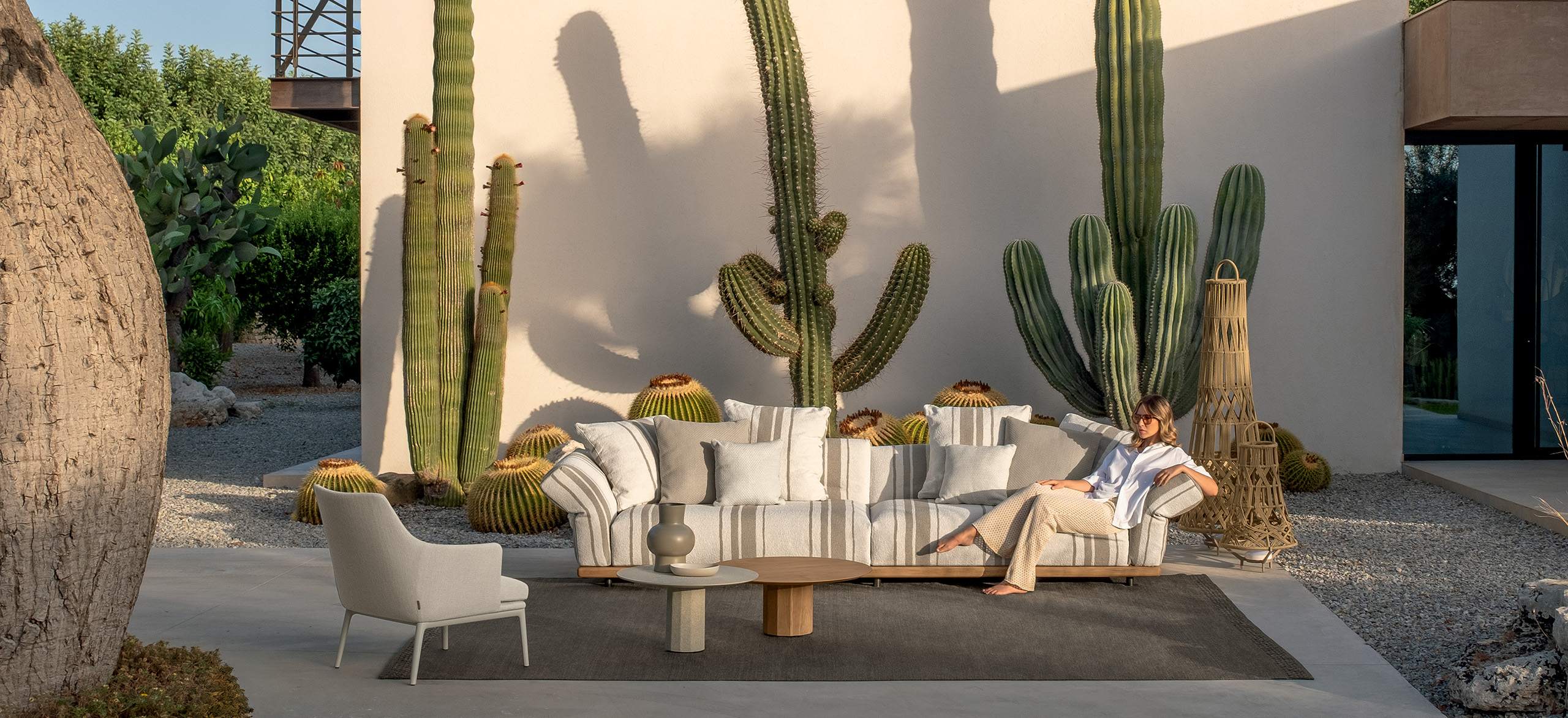 Elton ist eine Kollektion, die das Können von Talenti unterstreicht, die Grenzen zwischen Indoor und Outdoor durch die Raffinesse von Formen und Materialien zu verwischen. Eine unvergleichliche Modularität führt zu einer neuen Art, Außenräume zu erleben: Zum ersten Mal lassen sich Rücken- und Armlehnen der Sofas dank eines in die Struktur integrierten Mechanismus verstellen. Technologie im Dienst des Designs, fähig, dem Sofa eine bisher unerreichte ästhetische Geschmeidigkeit zu verleihen und die Möglichkeit zu eröffnen, den eigenen Komfort vollständig zu personalisieren. Die Kollektion umfasst außerdem Couchtische aus warmem Accoya-Holz, in Natur- oder Palisanderoptik, veredelt mit eleganten emaillierten Glasplatten.