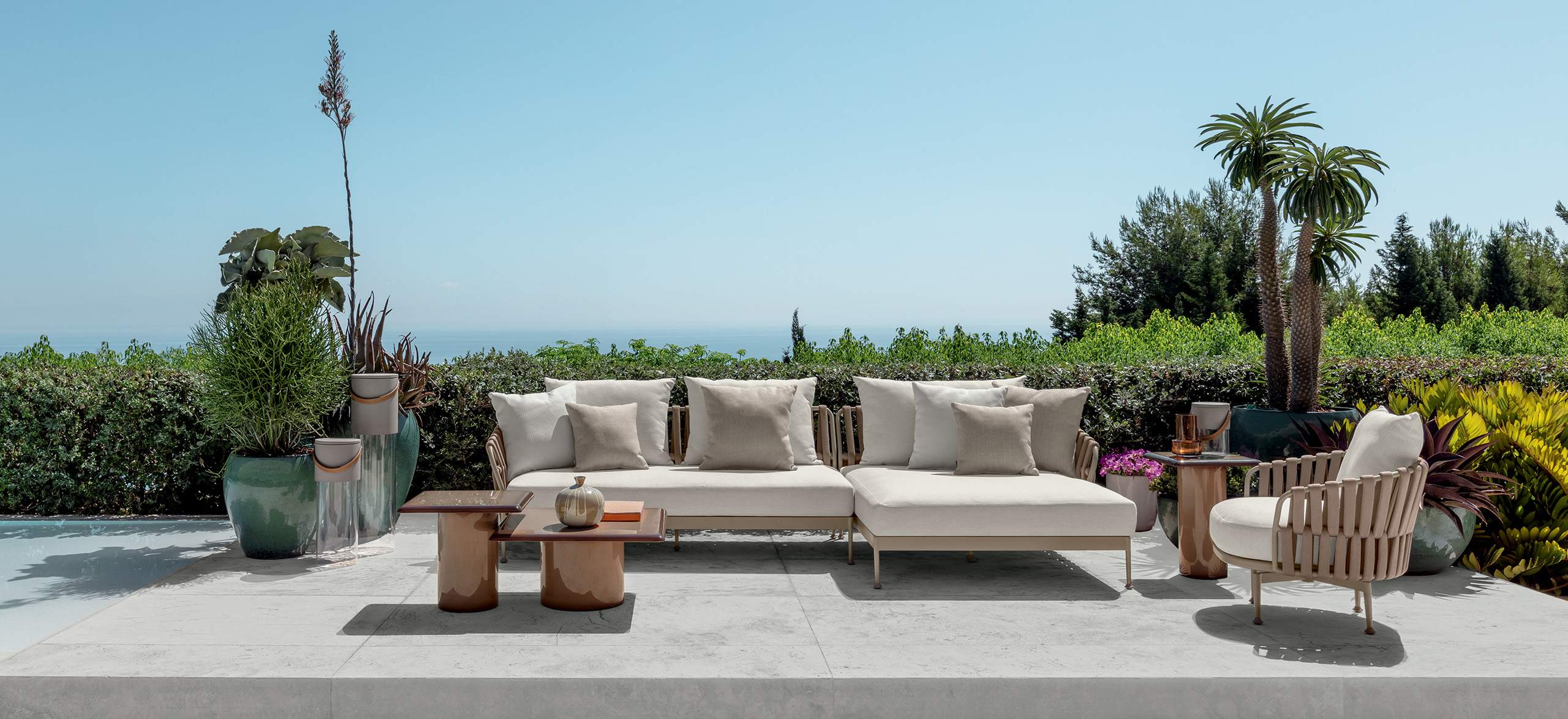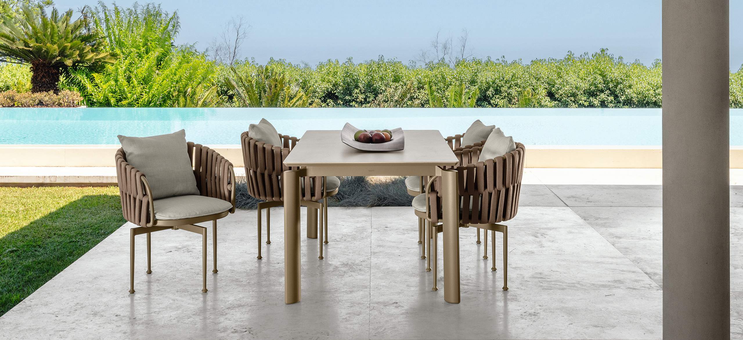 Im Vordergrund dieser Kollektion steht das Nebeneinander der Rahmen aus Aluminium, des Kordelgeflechts und der bequemen Polsterauflagen, wodurch sie ganz fraglos eine sinnliche Erscheinung im Outdoor-Bereich darstellt. Das Geflecht der dicken Kordeln zwischen den Rohrrahmen schenkt bei Sonnenlicht faszinierende Licht- und Schatteneffekte. Leichte und sinnliche Formen, die Ihre Privatsphäre schützen, für eine perfekte Erholung im Freien.