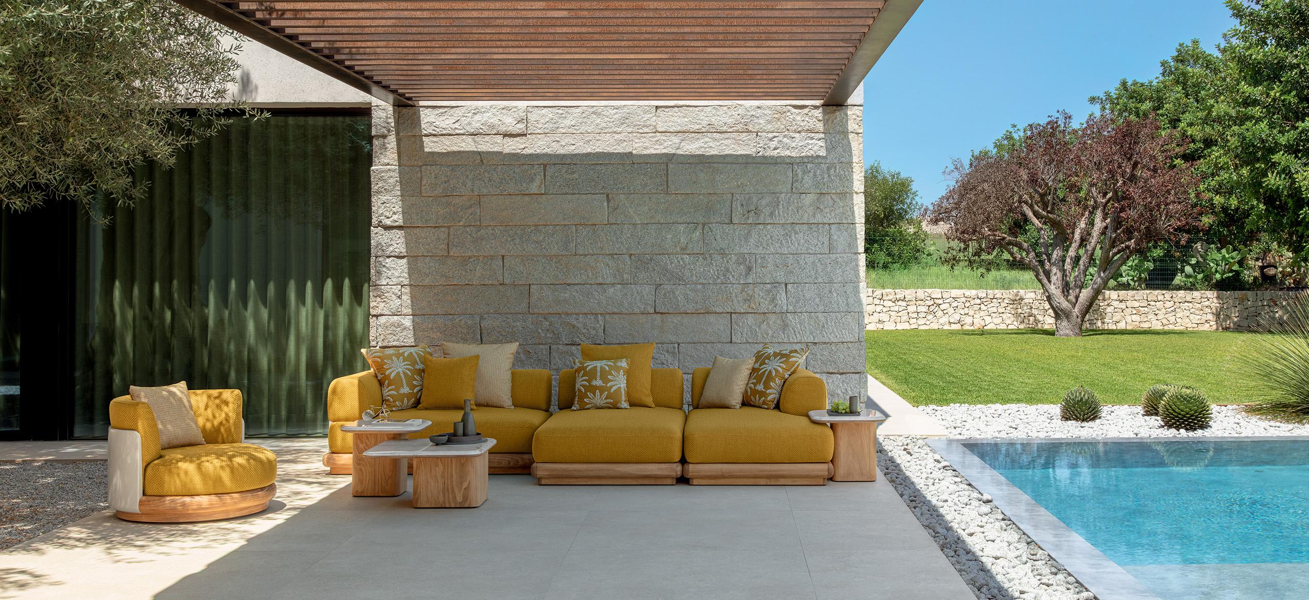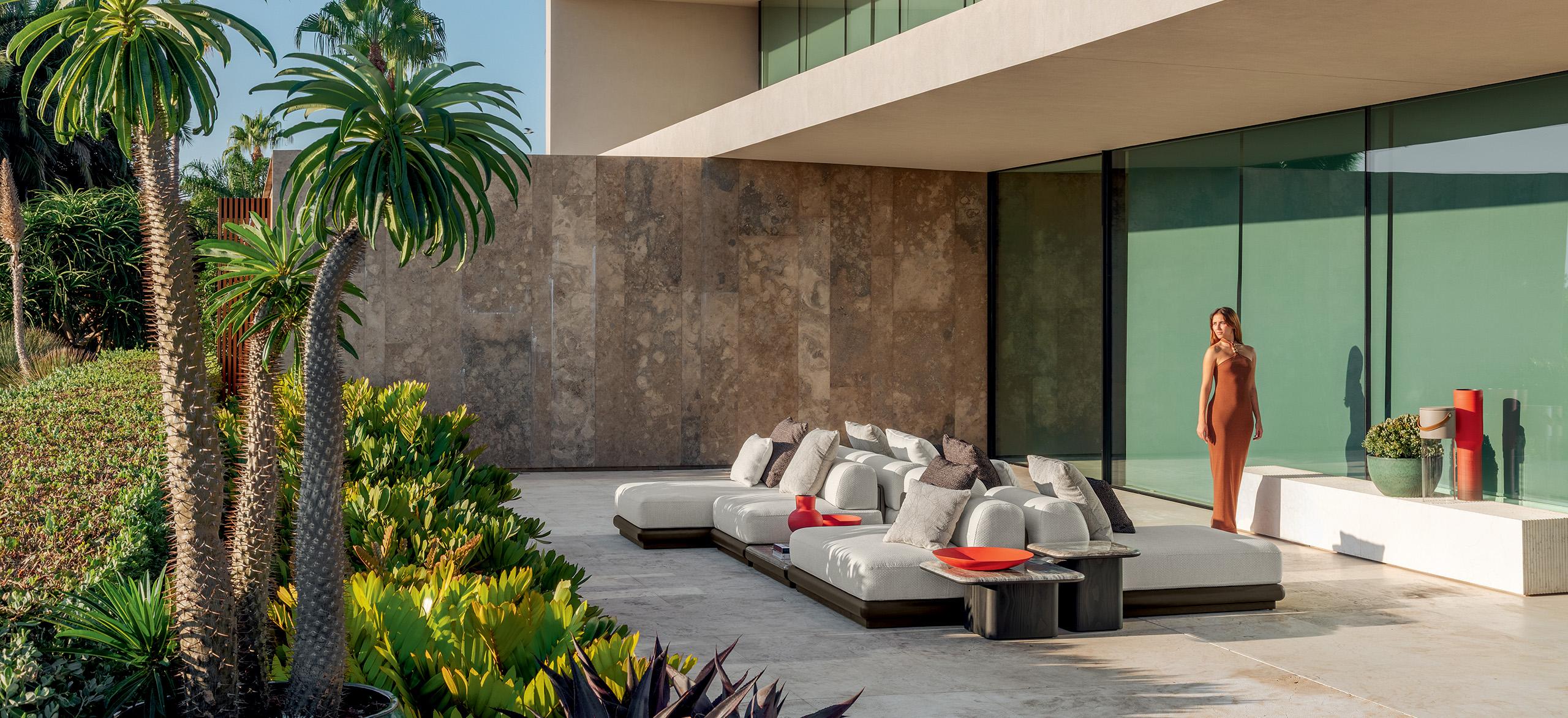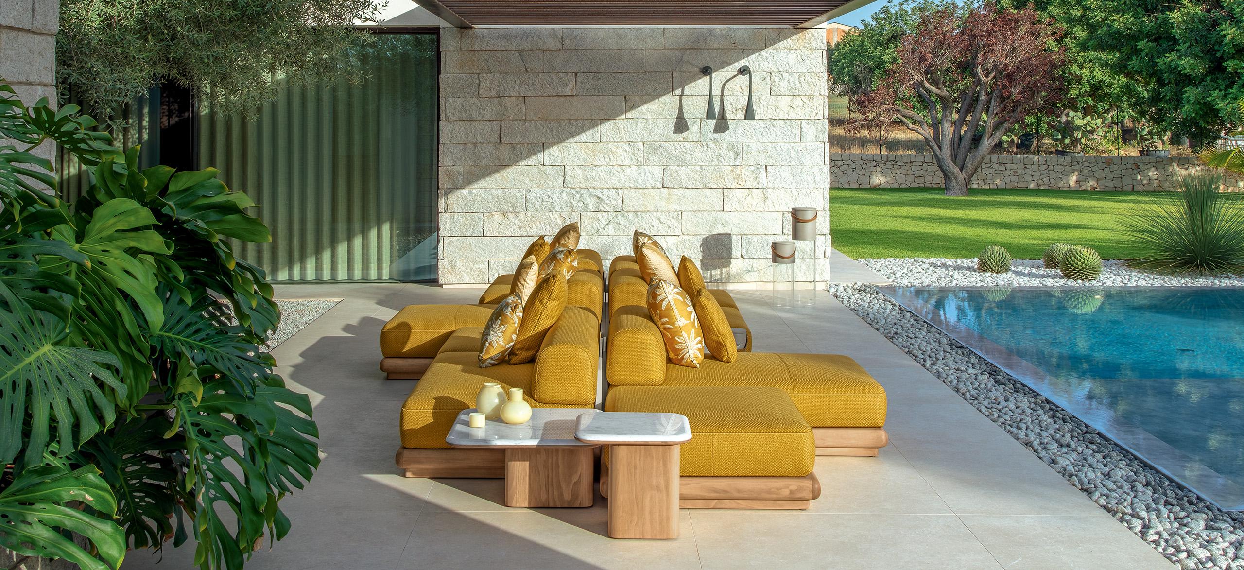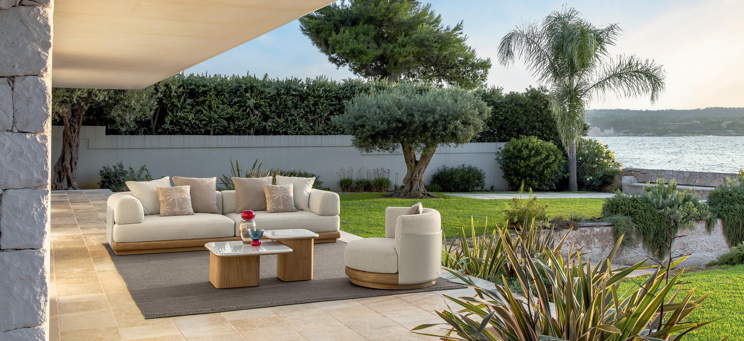Itaca ist eine Einladung, Ihren Außenbereich mit Eleganz und Komfort zu erleben, durch eine noch nie dagewesene Modularität. Inspiriert von der ikonischen Reise von Odysseus über ferne Meere und Länder, erschafft Carlo Colombo eine Oase des Vergnügens, in der man sich wiederfindet und die Vertrautheit des eigenen Paradieses im Freien genießen kann. Wie Inseln in einem Archipel fügen sich die vielfarbigen Module von Ithaca zusammen und teilen sich, um Kompositionen zu bilden, die immer originell, ständig in Bewegung und in der Lage sind, sich an jeden Raum und jede Nutzungsanforderung anzupassen. Die abgerundeten Profile, wie von Wellen aufgeweicht, kennzeichnen das Accoya®, das für die massiven Untergestelle in den Farbvarianten Honig und Palisander verwendet wird, und wiederholen sich in den Marmor- und Travertinprofilen, die die Couch- und Esstische schmücken und die Kollektion vervollständigen.