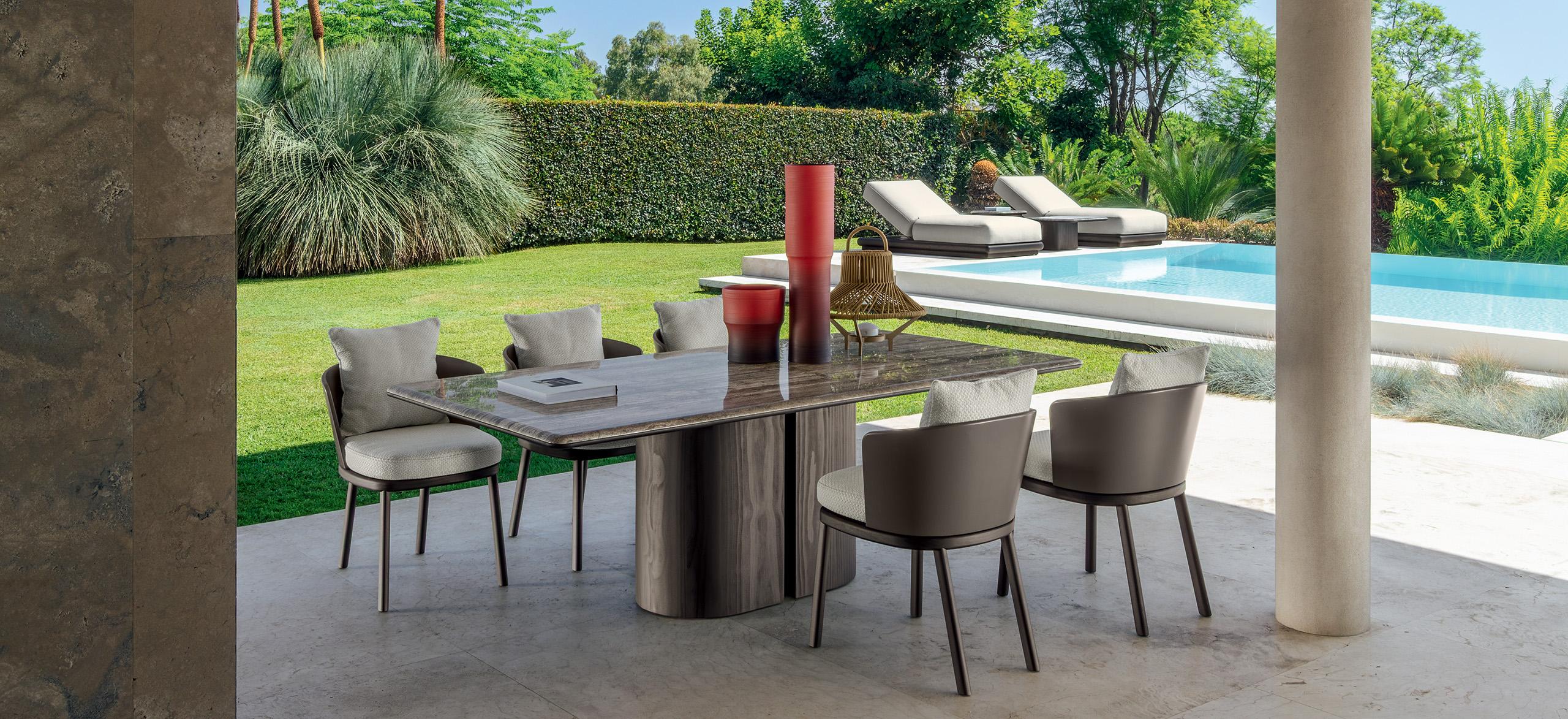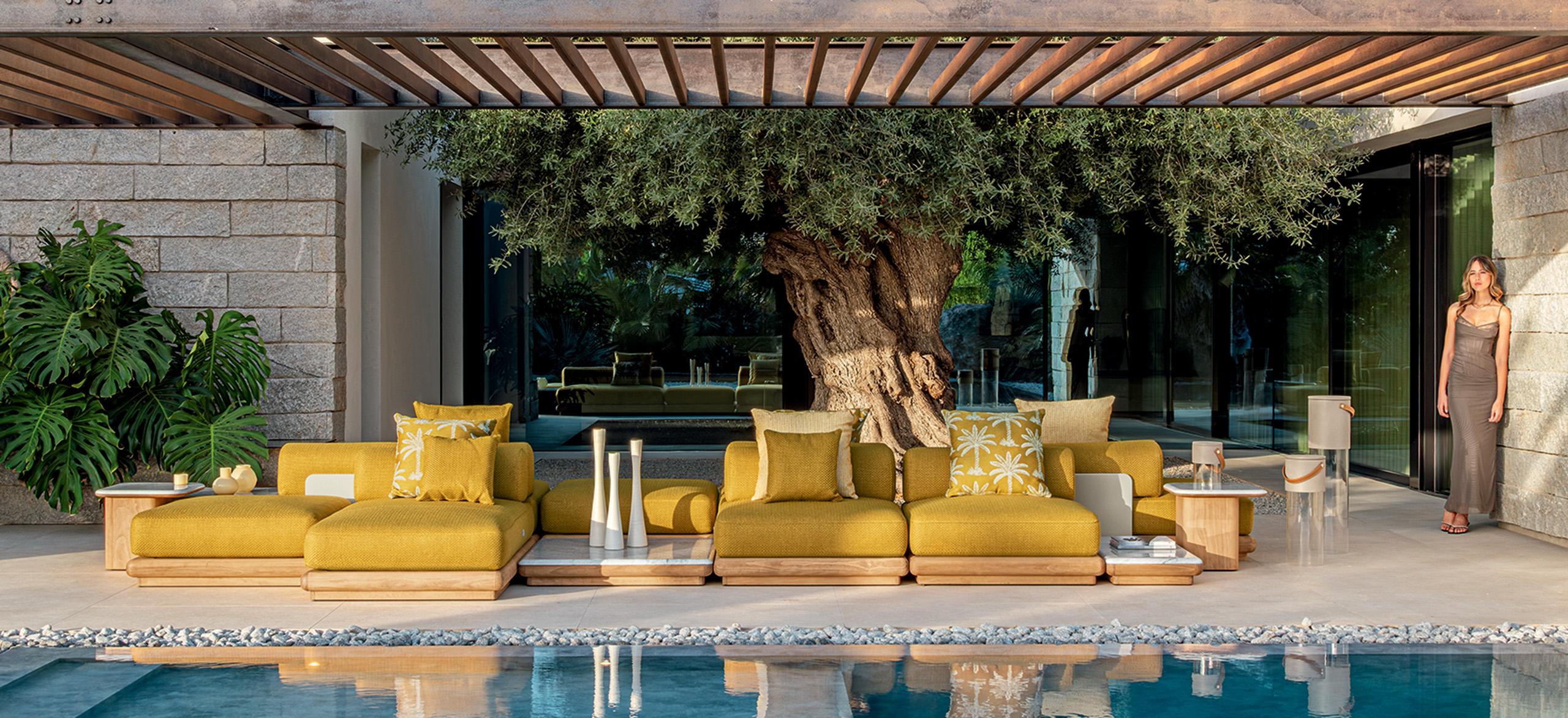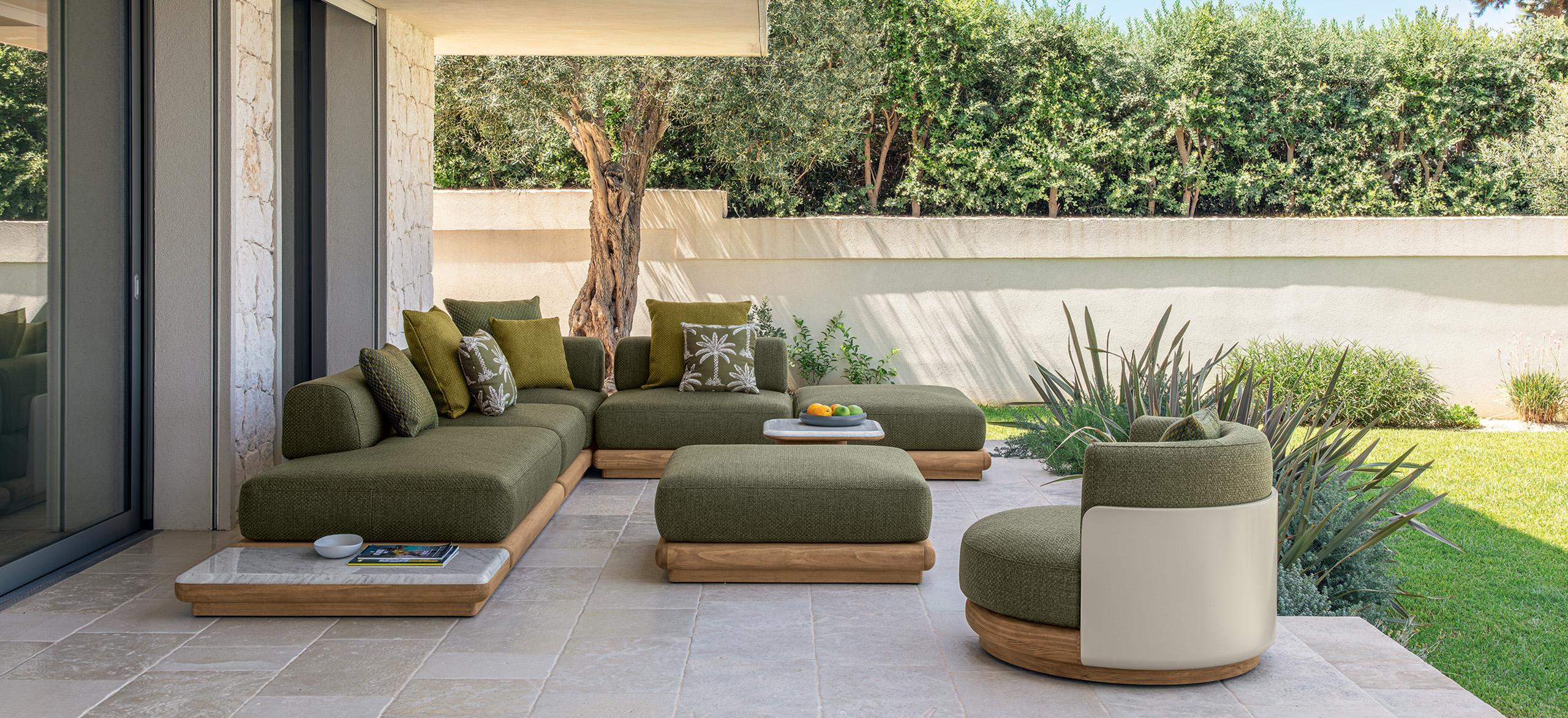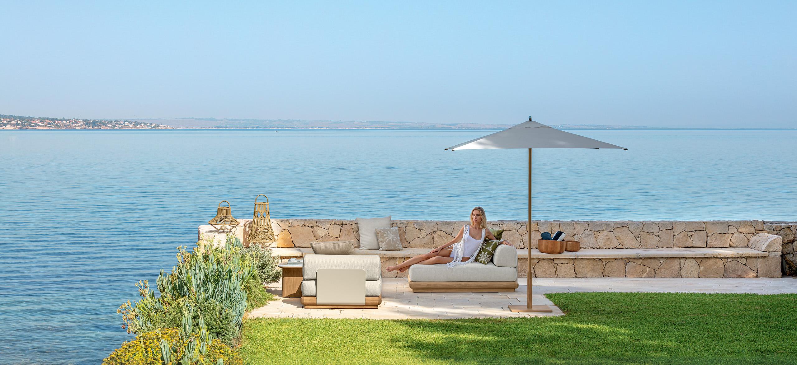 Itaca ist eine Einladung, Ihren Außenbereich mit Eleganz und Komfort zu erleben, durch eine noch nie dagewesene Modularität. Inspiriert von der ikonischen Reise von Odysseus über ferne Meere und Länder, erschafft Carlo Colombo eine Oase des Vergnügens, in der man sich wiederfindet und die Vertrautheit des eigenen Paradieses im Freien genießen kann. Wie Inseln in einem Archipel fügen sich die vielfarbigen Module von Ithaca zusammen und teilen sich, um Kompositionen zu bilden, die immer originell, ständig in Bewegung und in der Lage sind, sich an jeden Raum und jede Nutzungsanforderung anzupassen. Die abgerundeten Profile, wie von Wellen aufgeweicht, kennzeichnen das Accoya®, das für die massiven Untergestelle in den Farbvarianten Honig und Palisander verwendet wird, und wiederholen sich in den Marmor- und Travertinprofilen, die die Couch- und Esstische schmücken und die Kollektion vervollständigen.