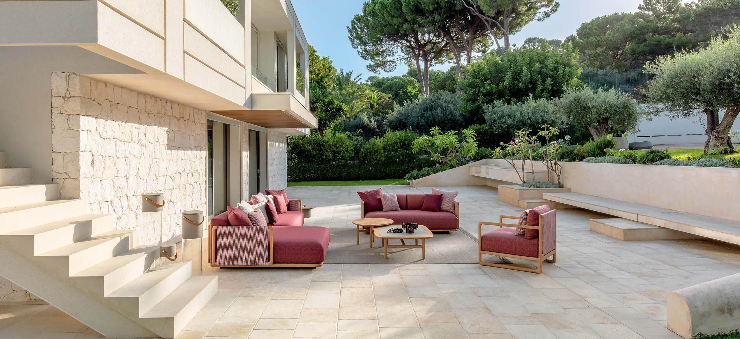 Aus dem eklektischen Kopf von Marco Acerbis stammt Jun, eine Kollektion, die die Eleganz von Teakholz mit großzügigen, aber kompakten Sitzgelegenheiten im orientalischen Stil verbindet. Die Holzprofile und -sitze kommunizieren ein miteinander dank der Ton-in-Ton-Bouclé-Stoffbezüge der Rücken- und Armlehnen, die leicht abnehmbar sind. Die unregelmäßig geformten Holztische sind mit verglasten Steinzeugplatten verziert und bieten ein perfektes Gleichgewicht zwischen Komfort und Stil, das jeden Außenbereich zu einer Oase des modernen Luxus macht.