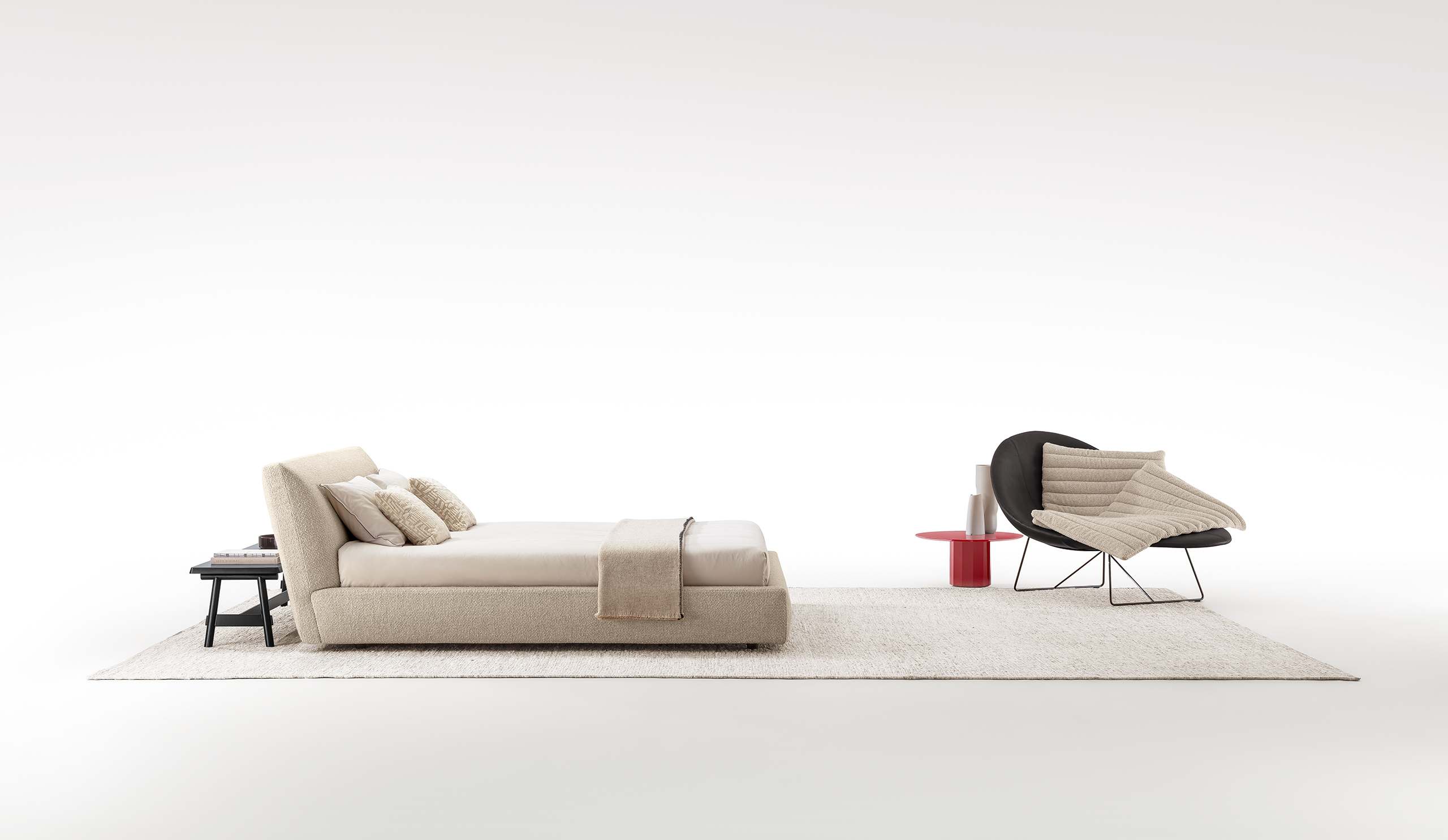Das Bett TAMASHI interpretiert den Schlafbereich mit einer strengen und zugleich harmonischen Formensprache, inspiriert von der Essenz der japanischen Tradition. Das sanft geneigte, gepolsterte Kopfteil ruht auf einer Konstruktion aus Mehrschichtholz und Massivholz, die Stabilität und dauerhaften Komfort gewährleistet. Der umlaufende Rahmen aus Mehrschichtholz ist mit hochdichtem Polyurethanschaum und Polyesterfaser gepolstert und sorgt für ein weiches, umhüllendes Liegegefühl. Der Bezug ist in Stoff oder Leder erhältlich. Die verzinkte Stahl-Unterfederung sowie die Druckguss-Aluminiumfüße mit Bodengleitern aus thermoplastischem Polymer vervollständigen ein ausgewogenes Design für bewusste Erholung.
