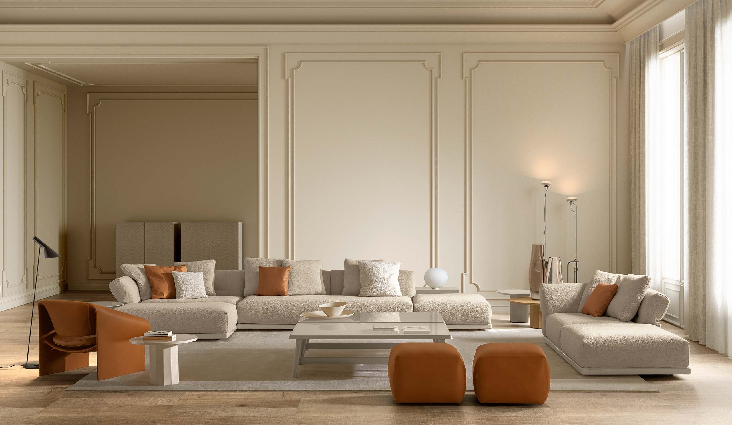 Eine stabile Struktur trifft auf hohen Sitzkomfort und schafft so eine funktionale Lösung mit starkem ästhetischem Anspruch. Elton versteht Modularität als gestalterische Freiheit und passt sich mit zeitgemäßer Eleganz sowohl Wohn- als auch Objektbereichen an.