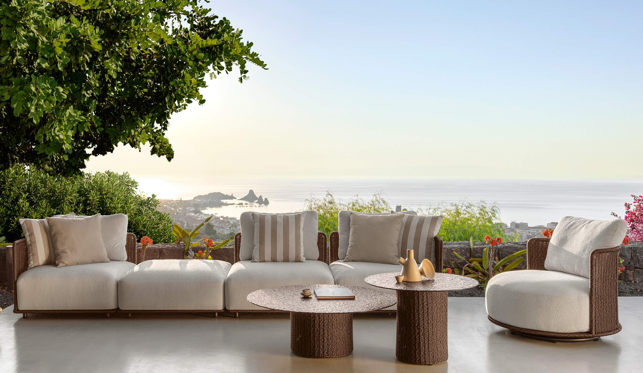 Der kleine Bond-Couchtisch ist als vielseitiges und raffiniertes Möbelstück konzipiert, das jede Wohnkonfiguration diskret ergänzt. Die zylindrische Struktur aus geflochtenem Rattan, leicht und widerstandsfähig, trägt eine strukturierte Glasplatte in warmen, eleganten Nuancen. Seine kompakte Größe macht ihn ideal als funktionale Ablagefläche, ohne seinen skulpturalen Charakter zu verlieren, der an die Ästhetik der Kollektion erinnert. Ein wertvolles Detail, das das Outdoor-Living bereichert.