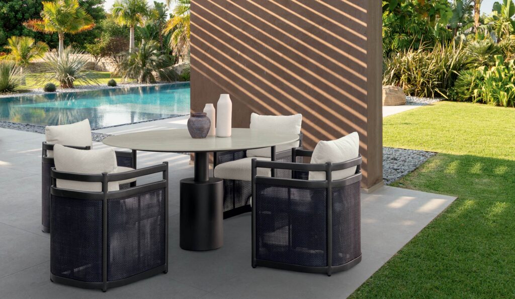 Der Esszimmersessel Edwin Alu greift das Konzept des Sessels auf, reduziert jedoch seine Größe und hebt den Sitz an, wodurch er zu einer einladenden und wirkungsvollen Dining-Lösung wird. Aus Mokka- oder warmweißem Aluminium, mit einer Struktur, die durch eine ultra-dünne Faser veredelt wird, in den gleichen Farbtönen, extrem beständig gegen Witterungseinflüsse, passt sich an traditionellere Umgebungen wie auch an modernere und avantgardistische.