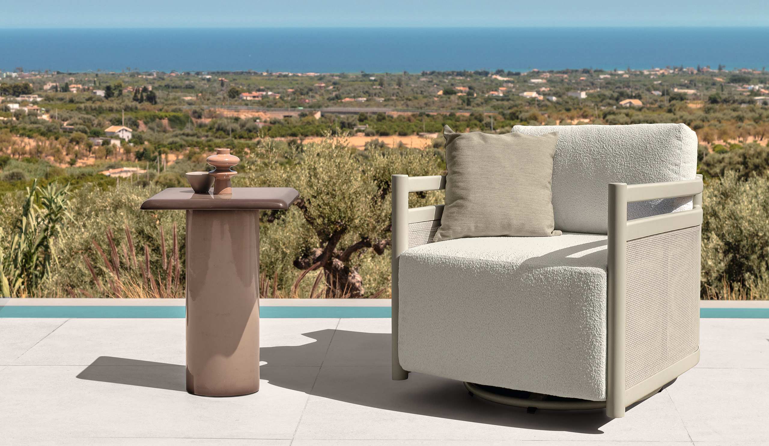 Der drehbare Wohnsessel Edwin Alu eignet sich dank seiner Vielseitigkeit, mit der Sie seinen wesentlichen Komfort genießen können, auch für große Loungebereiche. Aus Mokka-Aluminium oder warmweiss, mit Struktur veredelt durch eine ultra slim Faser, in den gleichen Farbtönen, extrem witterungsbeständig, passt sich sowohl traditionelleren als auch moderneren und avantgardistischen Umgebungen an. Der Stoff Bouclé in Cremeweiß macht den Sessel zu einem vielseitigen, aber dennoch eleganten Möbelstück.