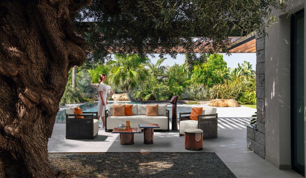 Der Wohnsessel Edwin Alu greift das Konzept des Sofas auf, reduziert jedoch seine Größe und wird zu einem eigenständigen Einrichtungselement, das in der Lage ist, den eigenen Außenbereich zu charakterisieren. Aus Mokka- oder warmweißem Aluminium, mit einer Struktur, die durch eine ultra-dünne Faser veredelt wird, in den gleichen Farbtönen, extrem beständig gegen Witterungseinflüsse, passt sich an traditionellere Umgebungen wie auch an modernere und avantgardistische. Der Stoff Bouclé in Cremeweiß macht den Sessel zu einem vielseitigen Möbelstück von großer Eleganz.
