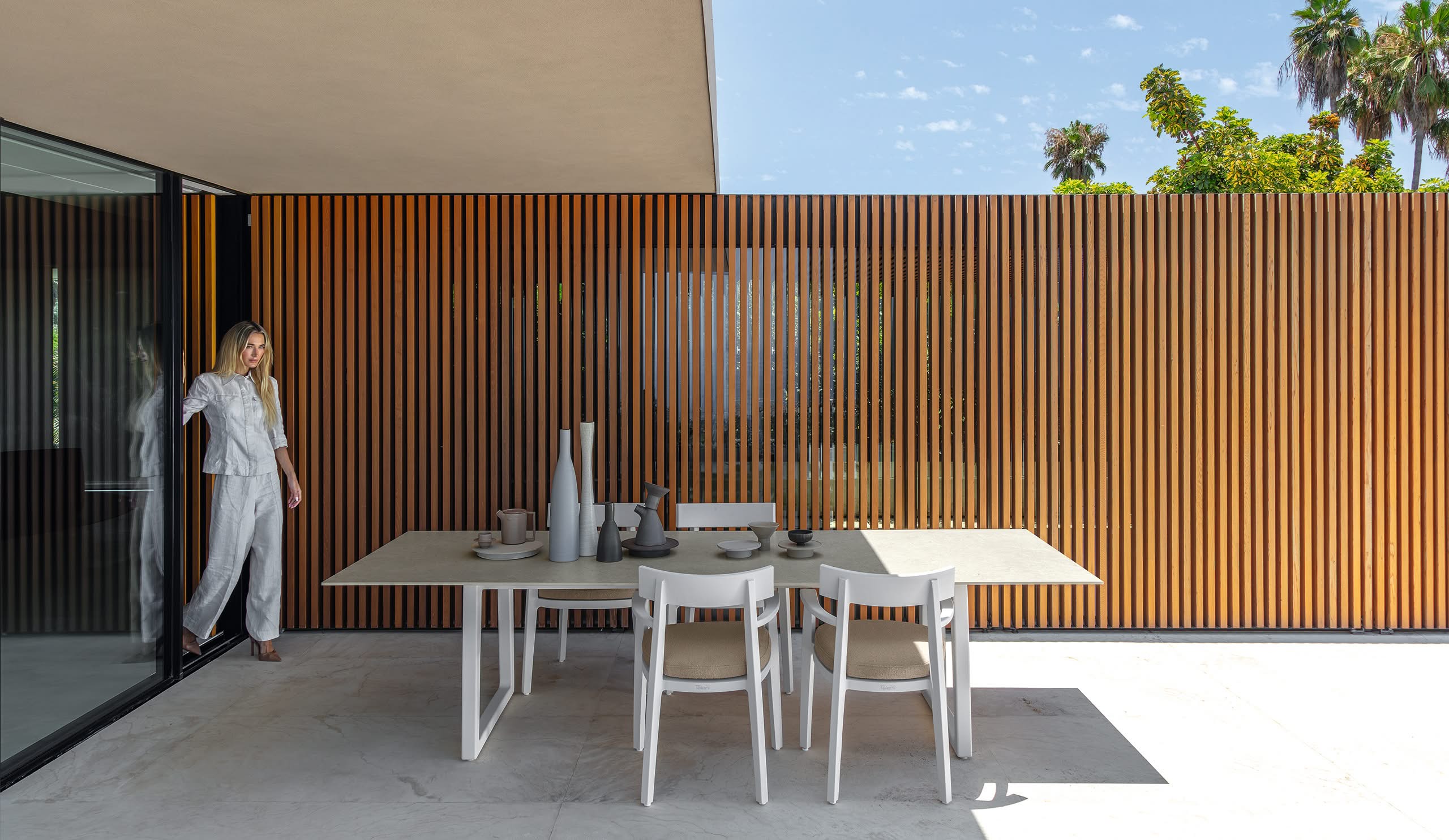 Die Esstische Ever 300×100 sind Ausdruck schlichter, dauerhafter Eleganz. Die Verbindung von minimalistischem Design und der Materialität des Aluminiums verleiht dem Außenbereich einen authentischen, zeitlosen Charakter. Die Stabilität der Materialien trifft auf die Leichtigkeit der Formen – für Möbel, die mit Stil und Harmonie in die Zukunft des Outdoor-Livings weisen.