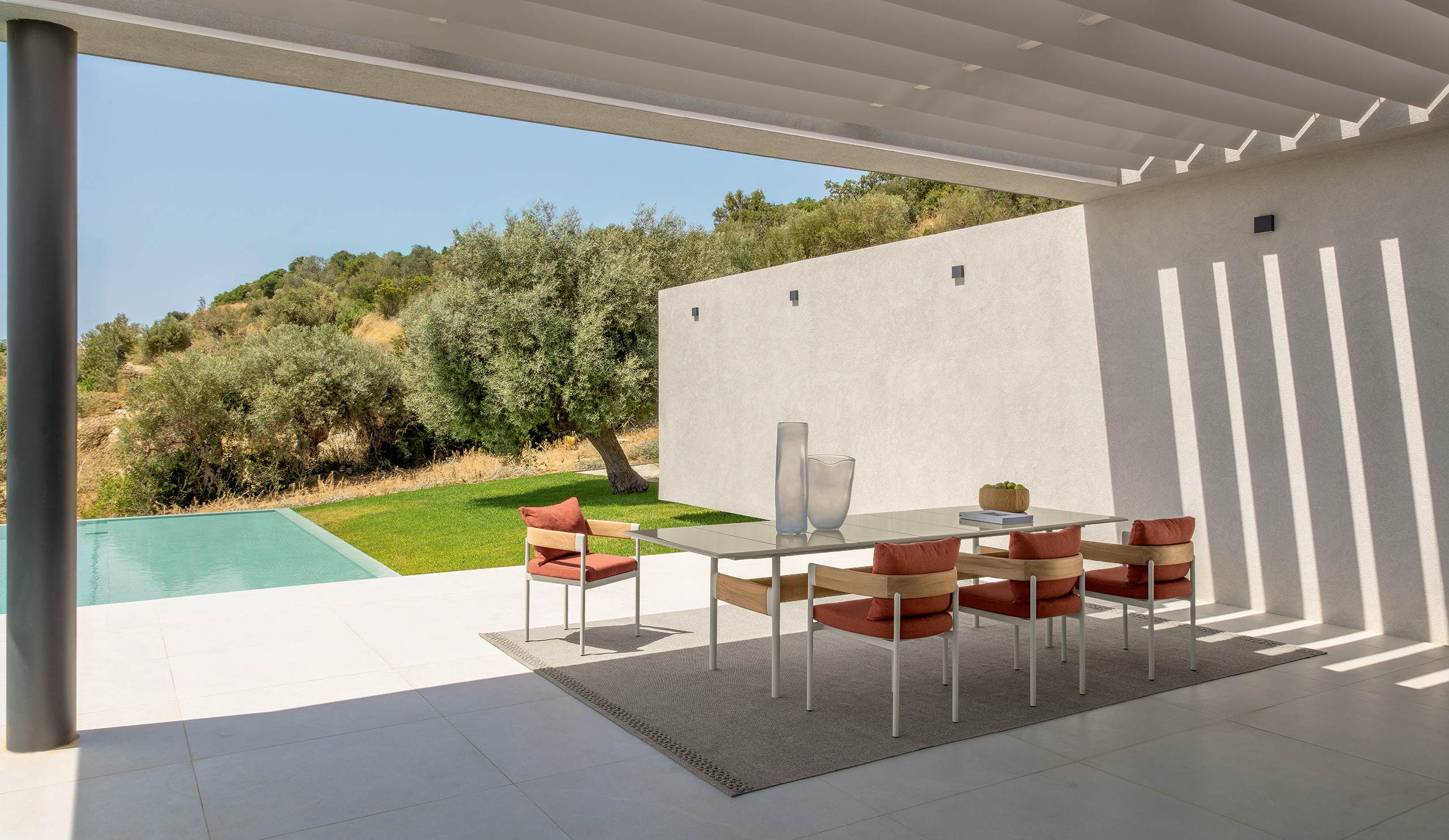 Großzügig und eindrucksvoll ist der rechteckige Esstisch der Protagonist geselliger Outdoor-Momente. Seine Aluminiumstruktur, in raffinierten Farbtönen erhältlich, harmoniert mit Teakkomponenten und schafft einen natürlichen, ausgewogenen Kontrast. Die Tischplatte aus großen Planken glasierten Feinsteinzeugs in Milchweiß oder Olivgrün ist ideal für zahlreiche Gäste und vereint Funktionalität mit Ästhetik in einem essenziellen, aber edlen Design. Seine szenische Präsenz verwandelt den Essbereich in einen vielseitigen, eleganten Raum.