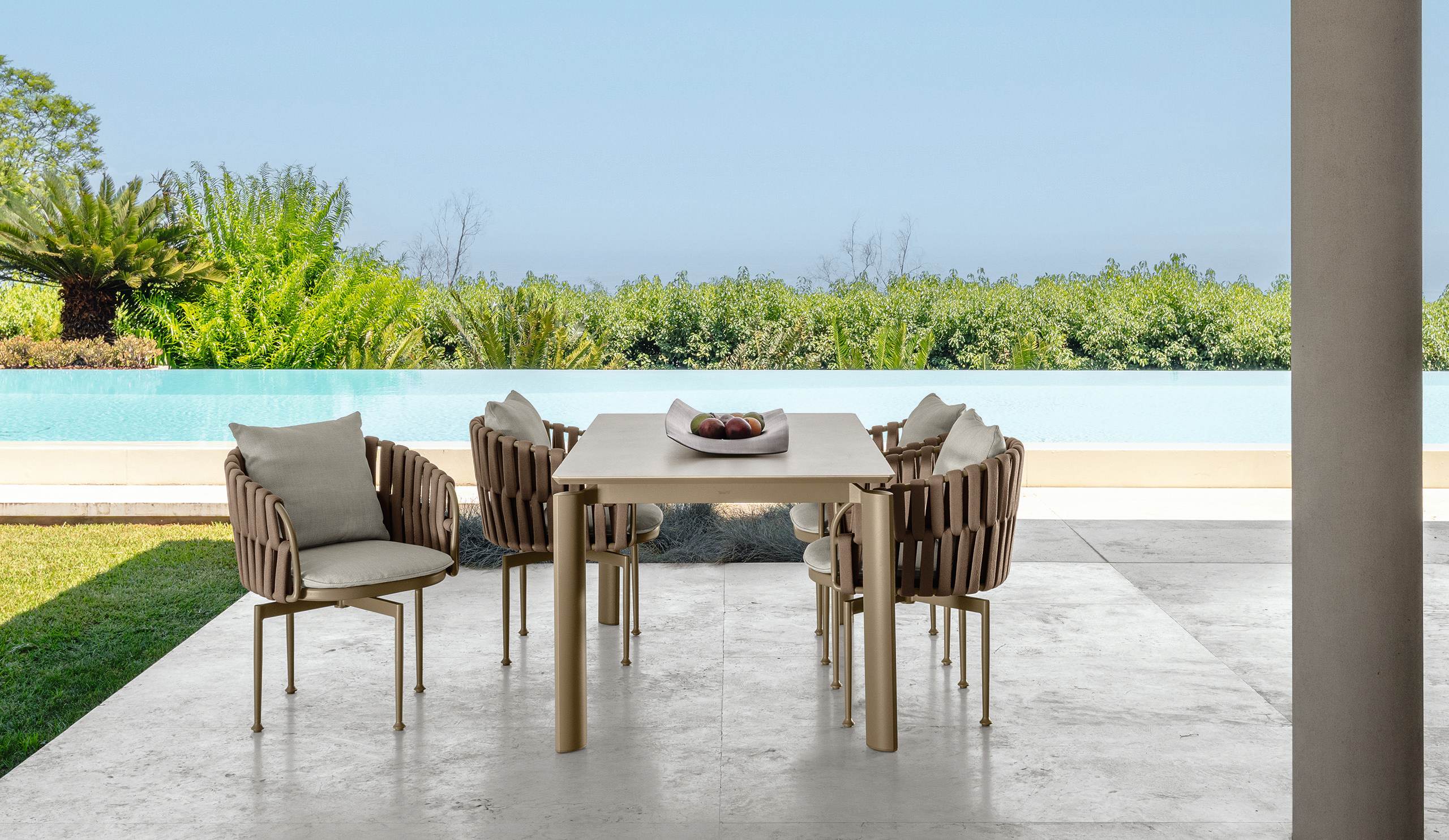Der Frame Dining Sessel vereint die Essenz der Kollektion und verwandelt Leichtigkeit und Komfort in eine einzige, raffinierte Sitzgelegenheit. Das schlanke und harmonische Aluminiumgestell steht im Dialog mit den weichen Polstervolumen und dem gepolsterten Seilgeflecht, das die Rückenlehne umschließt. Der drehbare Sockel verleiht dem Design Dynamik und bietet Bewegungsfreiheit, die das gesellige Erlebnis noch angenehmer macht. Sinnlich und elegant ist er das perfekte Element, um jeden Outdoor-Living-Bereich stilvoll aufzuwerten.