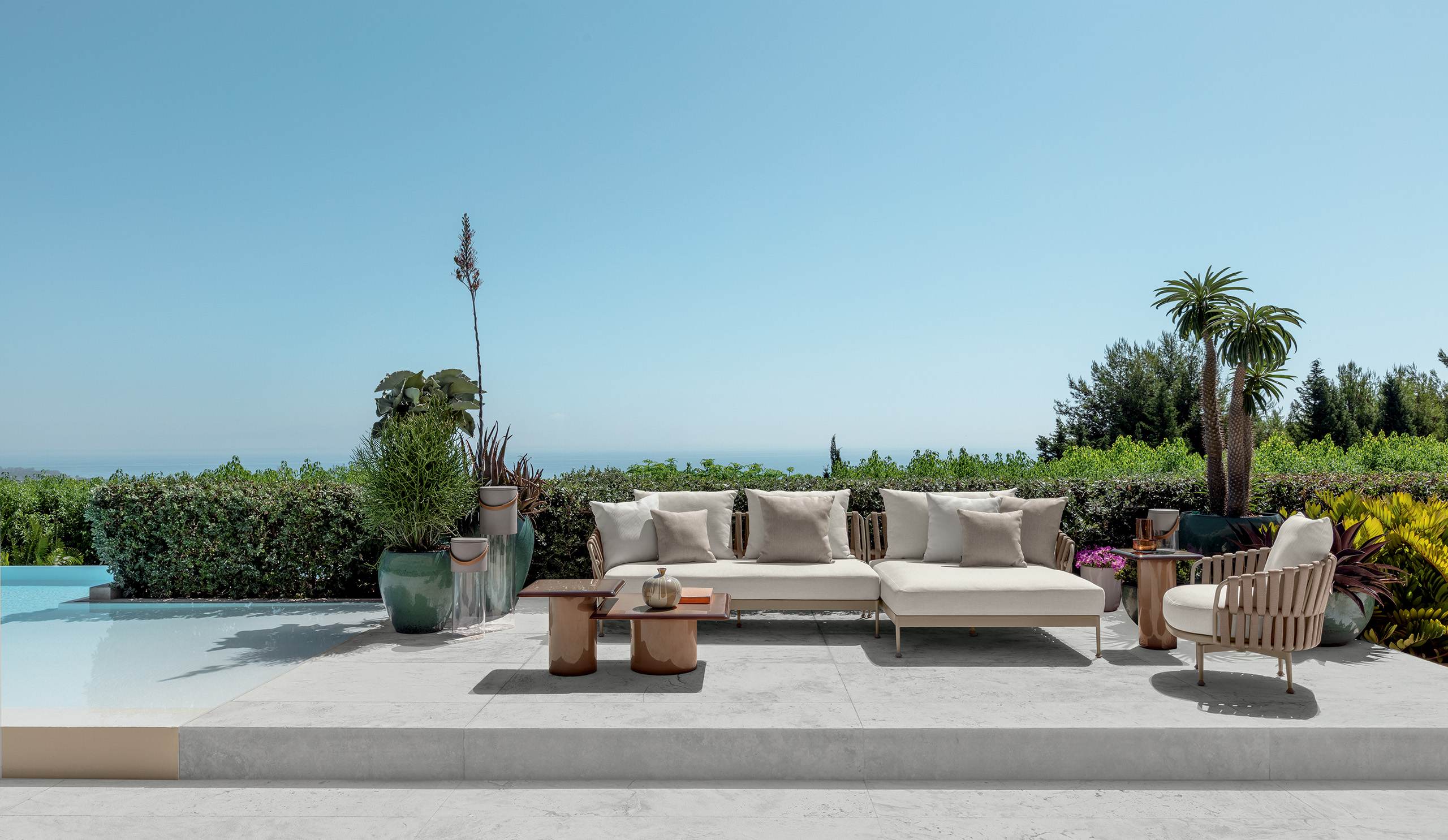Charakterisiert durch die Kombination aus Aluminiumstrukturen, Seilgeflecht und weichen Stoffpolstern verkörpert das modulare Sofa eine entspannte und zugleich moderne Eleganz. Das gepolsterte Seilgeflecht umhüllt sanft das Gestell und zeichnet eine feine Textur, die das Licht filtert und natürliche Schattenspiele erzeugt. Die Volumen vereinen sich in einem Gleichgewicht aus sinnlichen Linien und harmonischen Proportionen und bieten zugleich umhüllenden Komfort und dezente visuelle Privatsphäre.