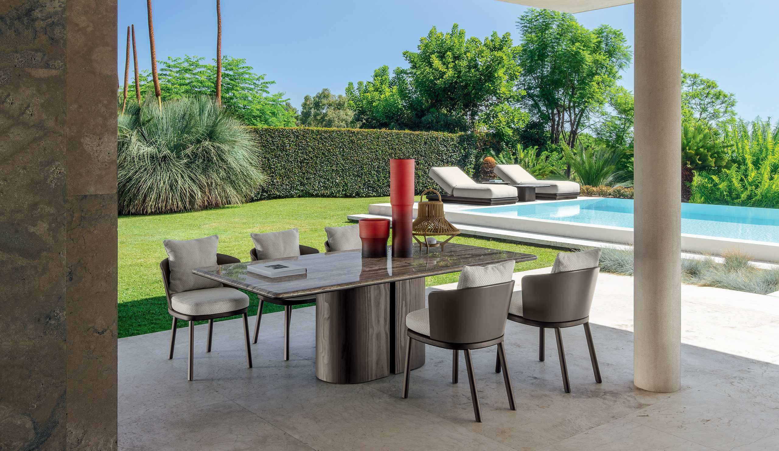 In perfekter Übereinstimmung mit den Strukturen der Sofas besteht der 220 cm lange Itaca-Esstisch aus einem monolithischen Accoya®-Sockel mit zwei zentralen halbkreisförmigen Beinen mit facettierter Oberfläche in zwei Farben, Teakholz natur oder Palisander, und einer Platte aus klassischem und elegantem weißem Carrara-Marmor oder aus dem moderneren Travertino Titanio in Schattierungen von Bronze bis Beige mit speziellen rauchgrauen Adern.
