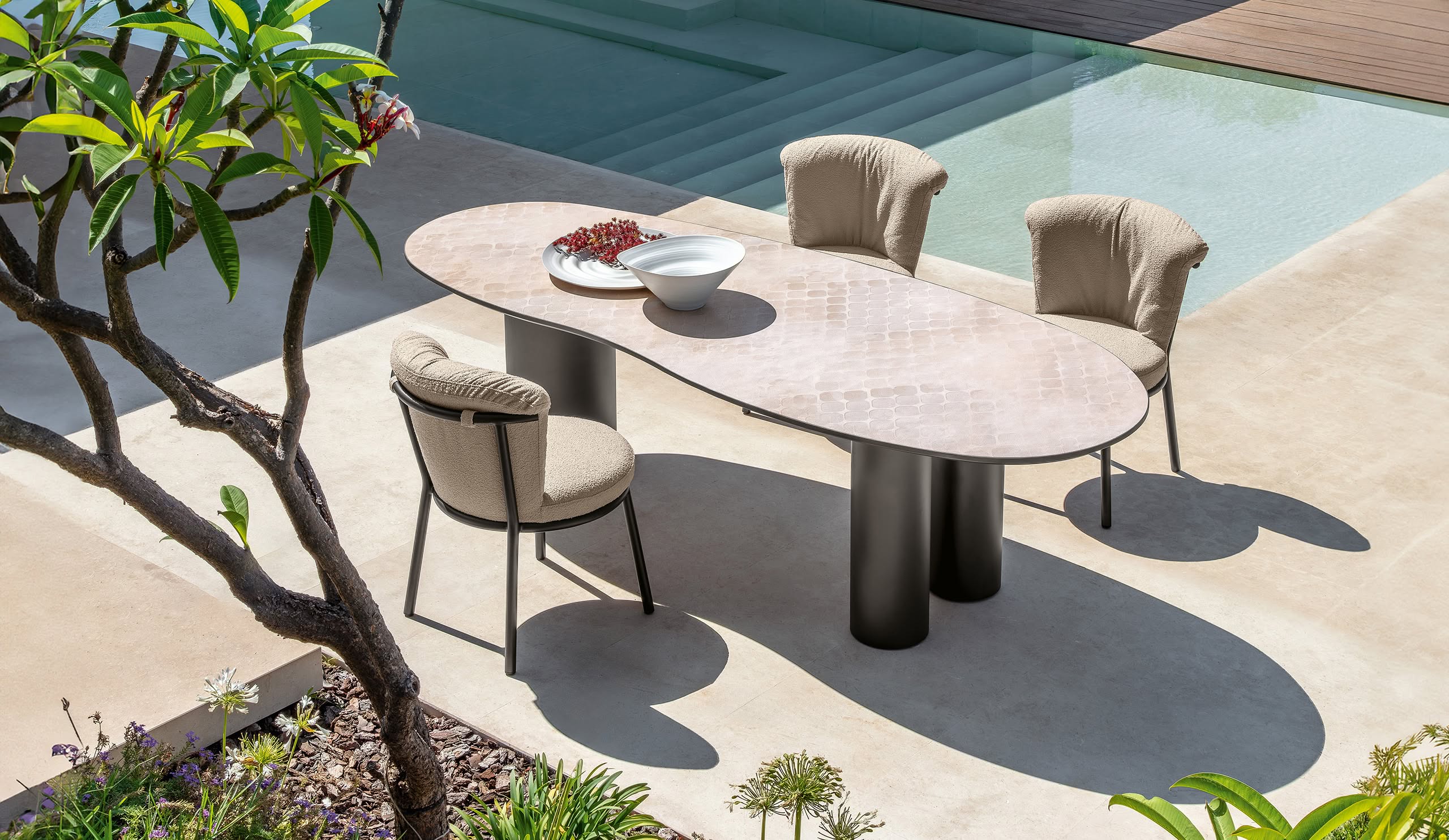 Die pulverbeschichtete Aluminiumstruktur steht im Dialog mit der strukturierten Oberfläche der Platte und ergibt ein raffiniertes, modernes Gesamtbild.