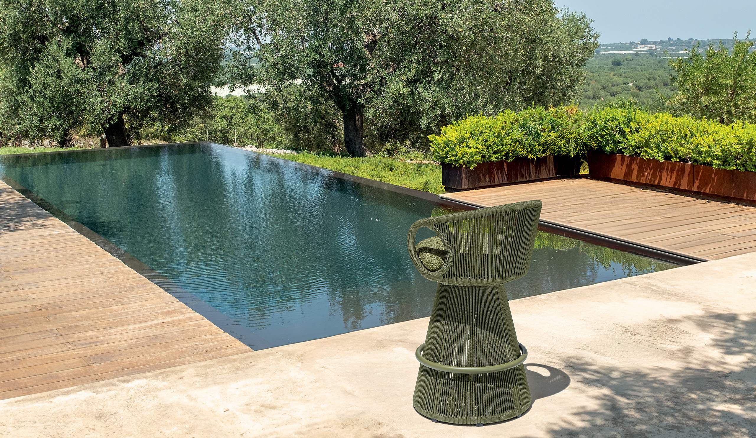 Der Drehhocker Karen ist ein Möbelstück, das zeitgemäßes Design und Funktionalität vereint. Seine Struktur hat eine konische Basis, die mit Seilen bedeckt ist, die Stabilität und einen Hauch von Eleganz bieten, während der gepolsterte Sitz und die geschwungene Rückenlehne für optimalen Komfort sorgen. Der Hocker ist mit hochwertigem Stoff bezogen und sein ergonomisches Design wurde entwickelt, um während der Mahlzeiten Halt zu bieten.