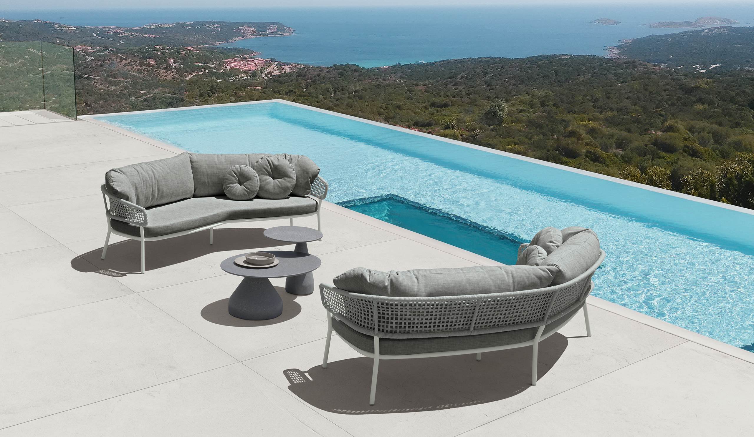 Das gebogene Sofa Outdoor-Kollektion Moon entstand beim Betrachten des Mondes. Die Rückenlehne erinnert in der Tat an die Form eines Halbmondes. Dieses von Cristian Visentin entworfene Sofa zeichnet sich aus durch die Schwerelosigkeit des Kordelgeflechts und die Verwendung von praktischem Aluminium. Die Rahmenkonstruktion aus Aluminium ist mit Seilkordeln aus grauem Synthetikmaterial umflochten. Die Polsterbezüge sind abziehbar, leicht zu reinigen und witterungsbeständig. Mit Quick Dry Foam-Füllung.