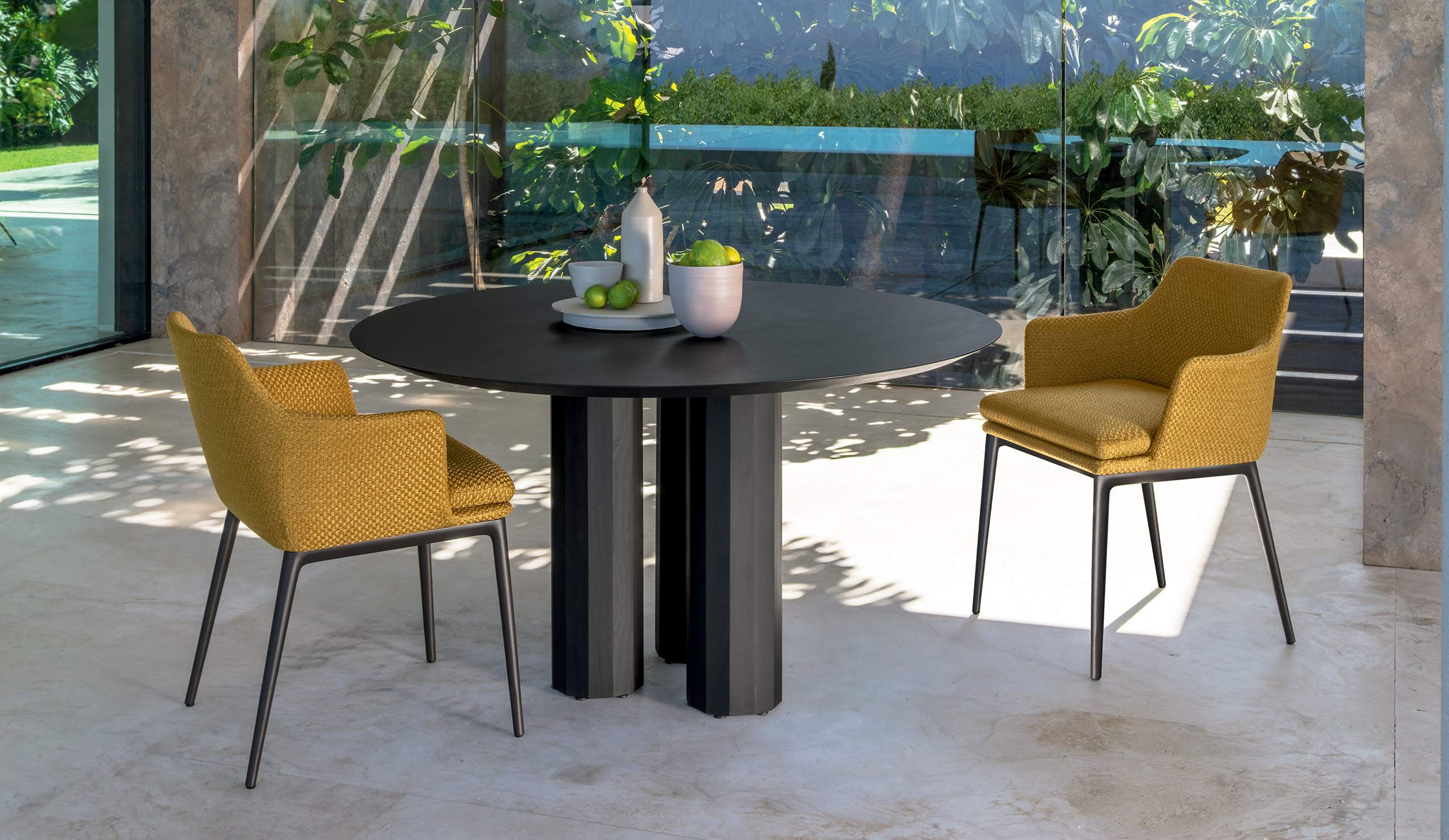 Der Esstisch Salinas Durchmesser 135 hat ein raffiniertes Design, das den Rohstoff nutzt und die Textur des Holzes hervorhebt. Es verleiht der Außenumgebung, in die es integriert ist, Charme und Eleganz und erinnert an die Atmosphäre von Salinas, der naturalistischen Region Ibizas, von der es inspiriert ist. Die drei zentralen Säulen, die den Tisch stützen, erinnern an die klassische Welt.